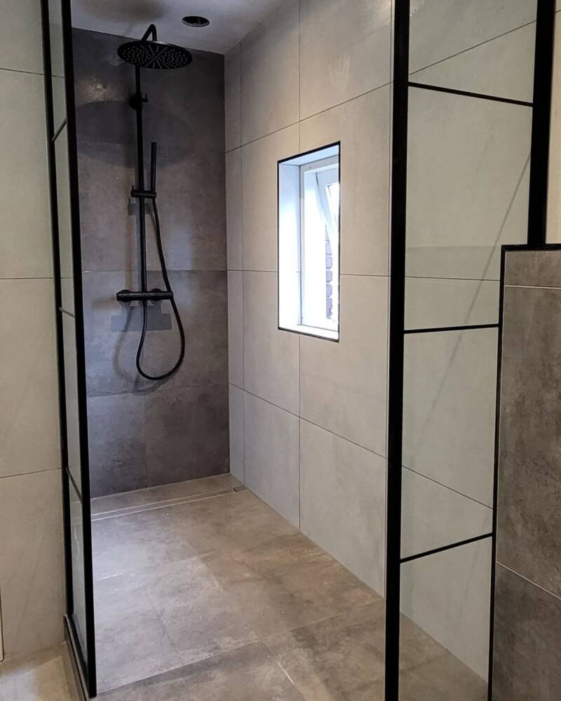 op de wanden gebruikt, gecombineerd met 60x60 Grafton Grey vloertegel. Chique en modern!