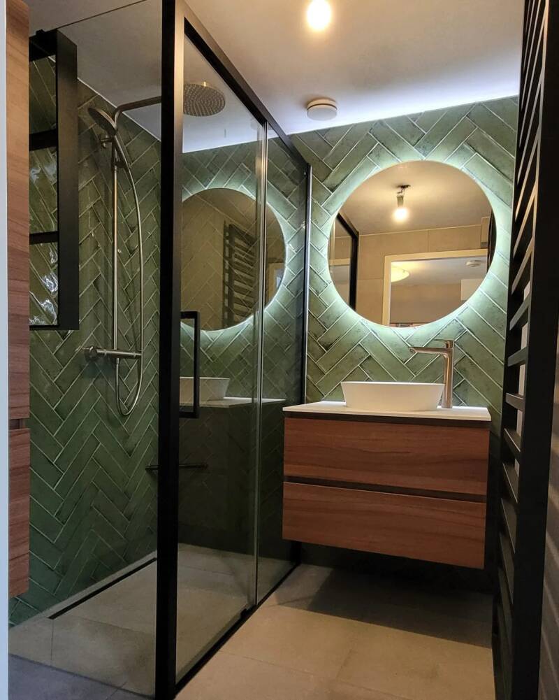 Een Retro badkamer! Op de muur in visgraatmotief onze Alchimia olive 7,5x30 tegel, op de vloer de prachtige lichte Betonlook Grafton Silver 60x60 tegel. Mooi in combinatie met gouden kranen en zwart sanitair.